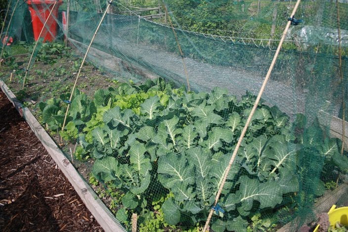 The brassica bed, the calabrese is in the foreground and is setting florets.